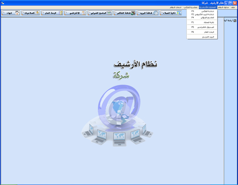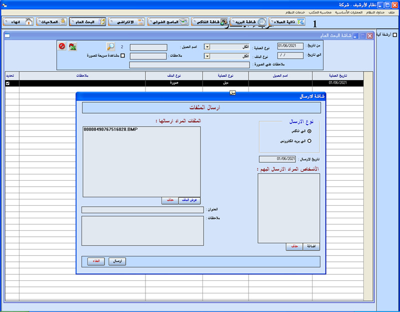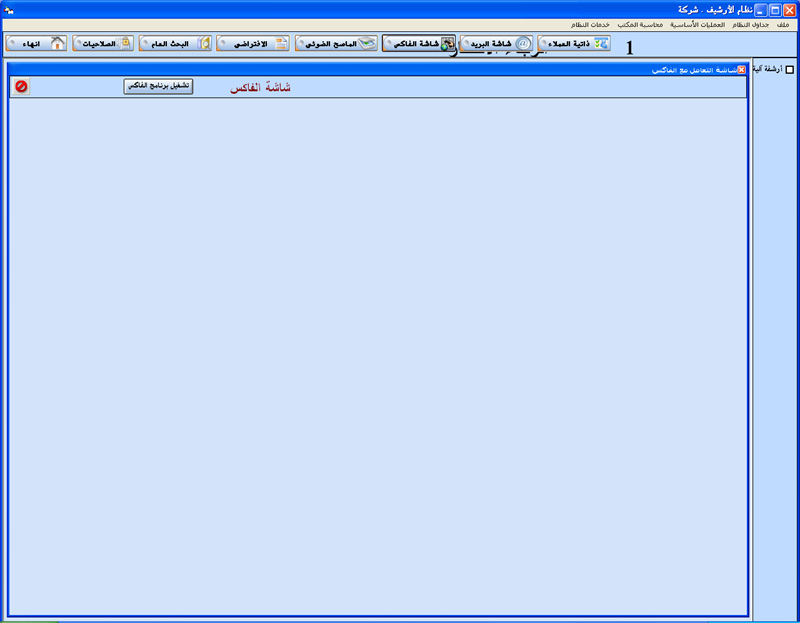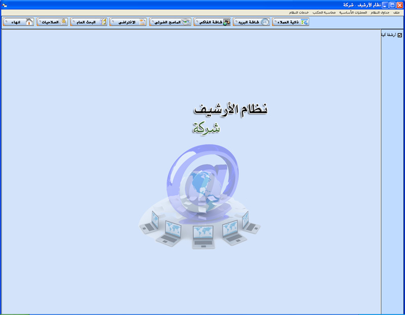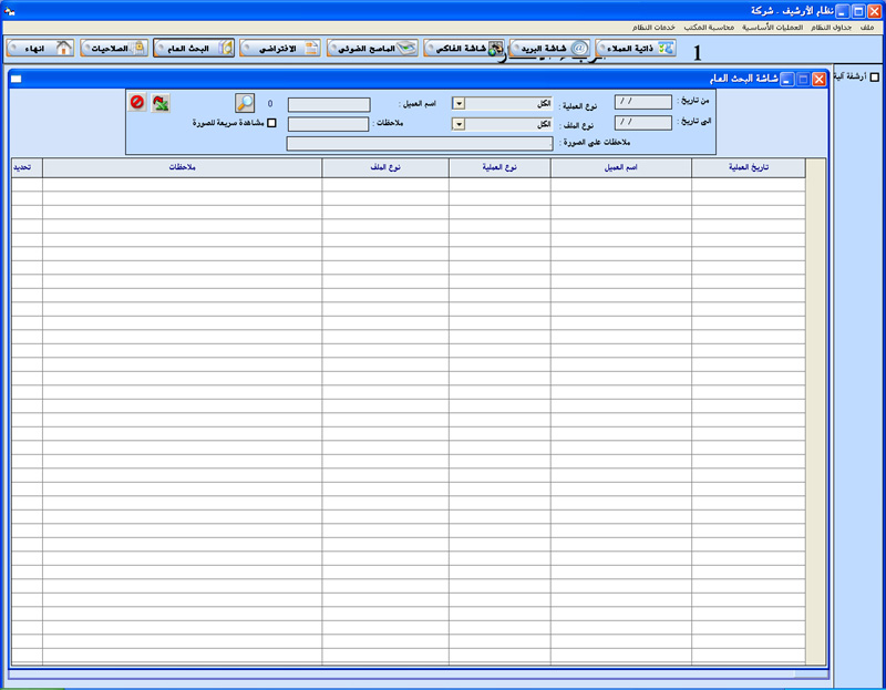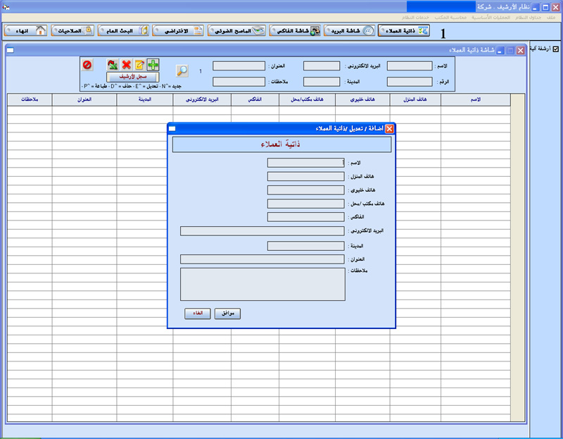 البرنامج مصمم ليقوم بأرشفة جميع العمليات الخاصة بعميل أو شركة و طباعة معلومات الأرشيف من صور و ملفات و بريد الكتروني و فاكس ....
